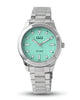 Elegancia que habla en silencio. Con su tablero verde menta y correa de acero inoxidable, este reloj no solo marca el tiempo, también marca estilo. Su diseño refleja calma, frescura y elegancia.